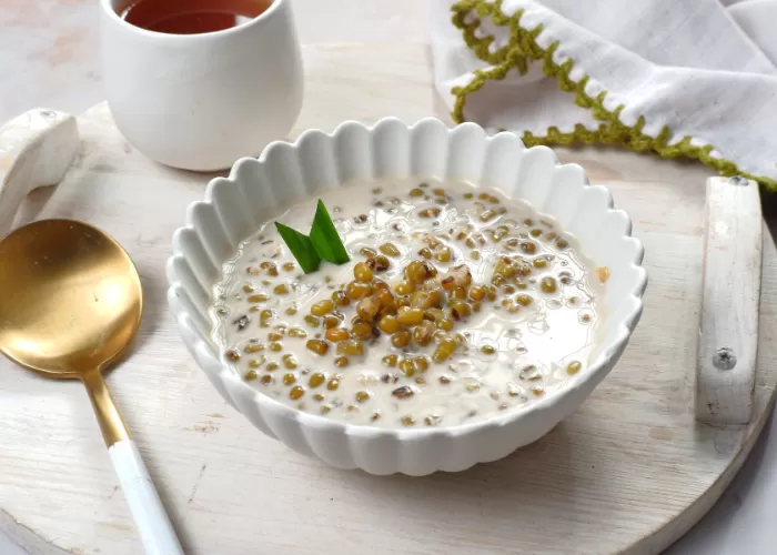 Masak kacang hijau dengan sedikit jahe hingga lembut. Gunakan santan encer atau ganti dengan susu rendah lemak. Maniskan dengan gula aren secukupnya. Kacang hijau kaya protein nabati dan serat, menjadikannya pilihan takjil yang sangat mengenyangkan dan menyehatkan.